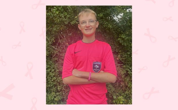Hugo CLETON, jeune arbitre du district qui souhaite apporter son soutien pour Octobre rose en arbitrant ses matchs en maillot rose en soutien à la lutte contre le cancer.