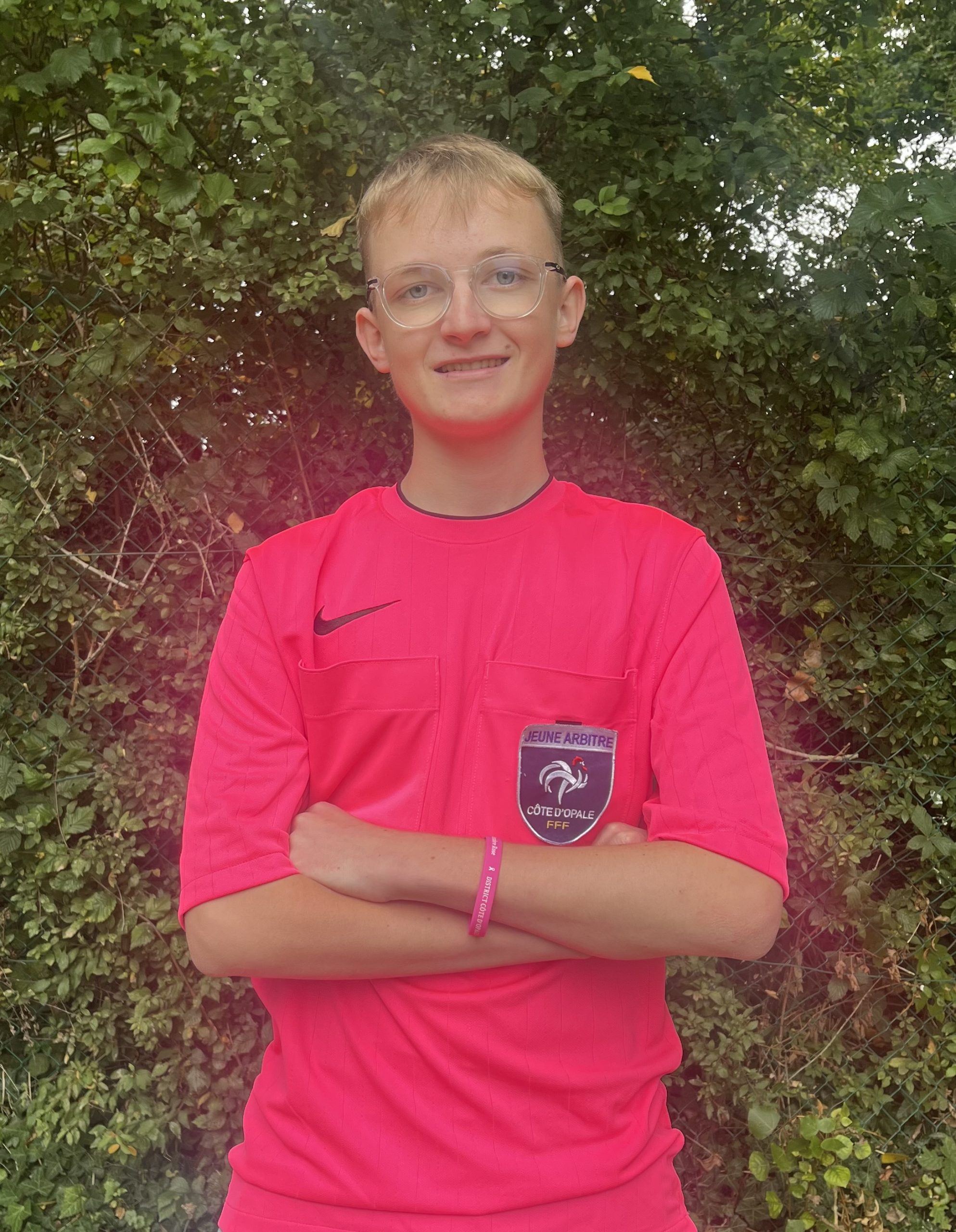 Hugo CLETON, jeune arbitre du district qui souhaite apporter son soutien pour Octobre rose en arbitrant ses matchs en maillot rose en soutien à la lutte contre le cancer.