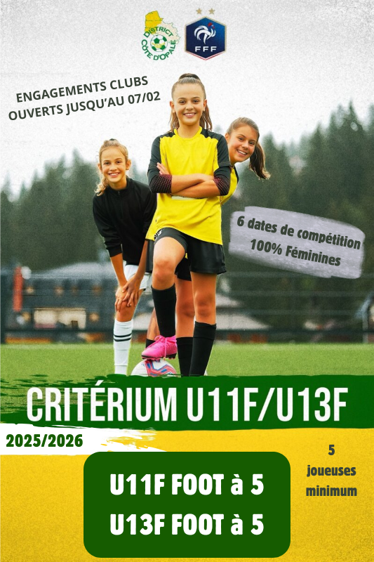 Cette équipe pourrait participer au Critérium U11F en Foot à 5, ou U13F en Foot à 5, en plus de la compétition garçon dans laquelle vos licenciées sont déjà engagées.